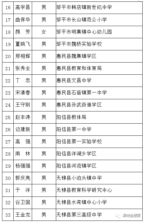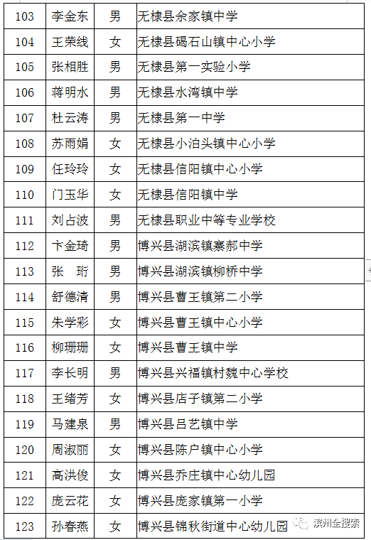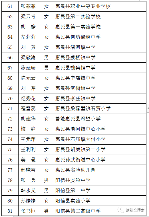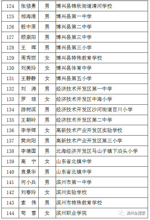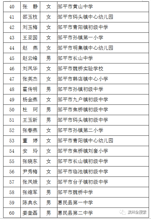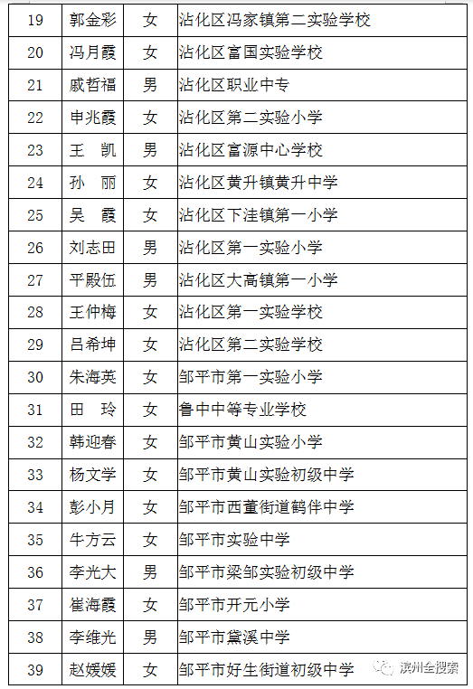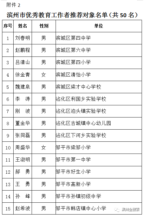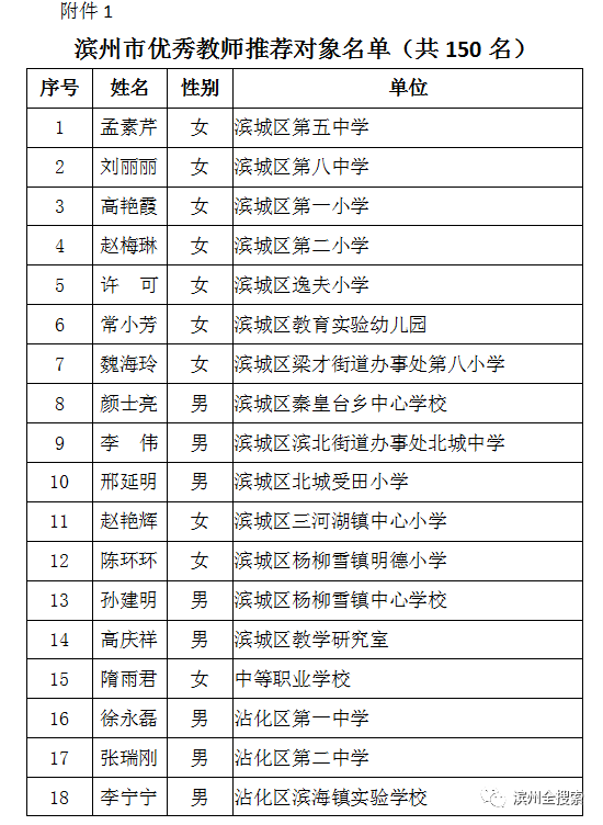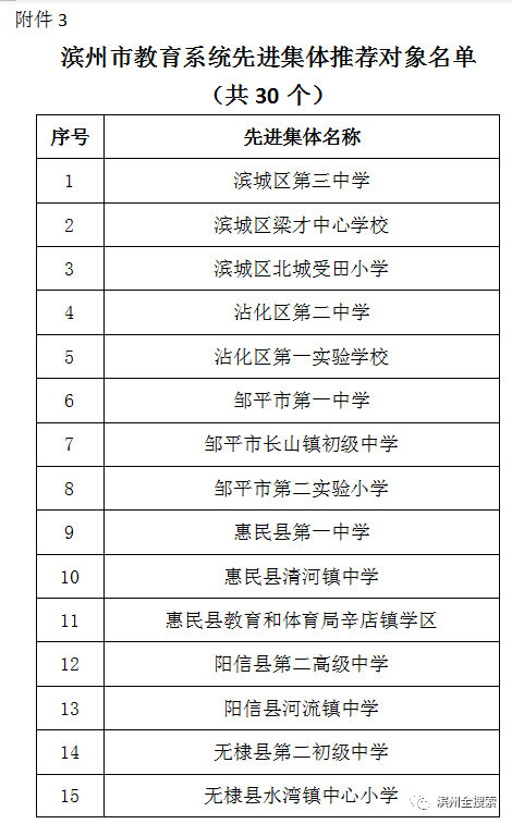 根据滨州市教育局(市委教育工委)《关于开展全市教育系统评选表扬工作的通知》(滨教通〔2019〕47号)要求,经所在单位、所在地教育部门自下而上逐级审核推荐,市教育局党组研究,确定孟素芹等150位同志为滨州市优秀教师正式推荐对象,刘春明等50位同志为滨州市优秀教育工作者正式推荐对象,滨州市滨城区第三中学等30个单位为滨州市教育系统先进集体正式推荐对象,现予以公示。如对公示对象有异议,请于2019年8月24日至2019年8月28日期间,以电话、电子邮件、传真或信函等形式向市教育局反映(信函以到达日邮戳为准)。反映情况要客观真实,以单位名义反映情况的材料需加盖单位公章,以个人名义反映情况的材料应签署真实姓名并提供联系方式。