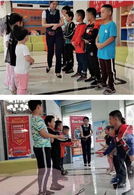 工作人员为现场人员展示了服务“七部曲”及基本礼仪知识。同时每位“小银行家”都亲身体验了如何使用叫号机及智能柜员机的使用。