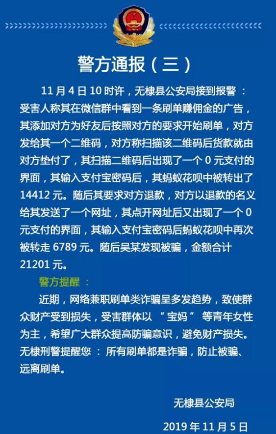 为此,警方提醒,希望广大市民朋友不要有“贪图小便宜”和“轻轻松松赚大钱”的心理,不要轻信网上所谓的高额回报,不要轻易点击陌生人发来的链接;找兼职工作要去正规的招聘、公司和中介平台,签订劳务合同,以保护自己的合法权益。网络刷单是一种违法的行为,任何要求垫资的网络刷单都是诈骗,遭遇诈骗要立即报警,并将对方的QQ、微信、电话号码、聊天记录等留存提交给警方,以便警方破案。