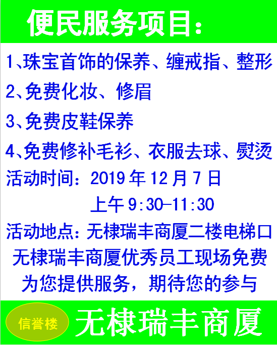2019年12月7日无棣瑞丰商厦便民服务将围绕您生活更美好,更便捷开展助力活动,为您想的更多,做的更多,助力您美好品质生活。