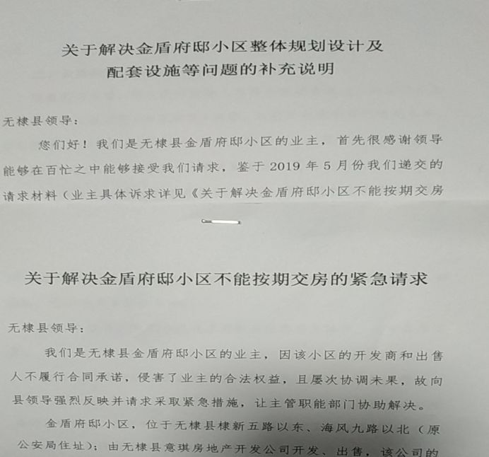 12月4日,无棣县金盾府邸小区业主代表联系晨报记者,反映买房遇到的糟心事:开发商逾期交房。购房合同上原定于1#2#5#楼2018.05.31交房。3#4# 楼2018.10.31交房,业主至今依然没有拿到钥匙;因为没有在该小区入住落户,不能提供满一年以上的物业缴费证明,致使孩子不能在该小区所属的第二实验小学上学他们要求开发商按照合同赔付违约金,相关部门尽快出具房屋质量验收报告,解决孩子上学和电梯太阳能不能使用的问题,尽早办理房产证,退还部分业主的公积金贷款保证金。