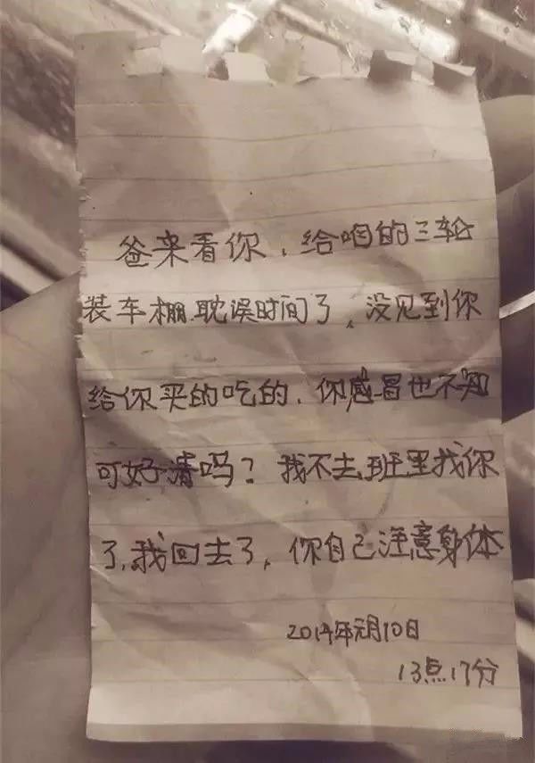 一位父亲去学校看望自己的儿子,带了一箱牛奶和一大包好吃的,还留下了一张这样的纸条…