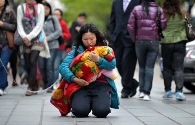 广州天河路,一位母亲怀里紧紧抱着孩子,往体育中心方向边走边跪,丝毫不顾及旁人鄙夷的目光。