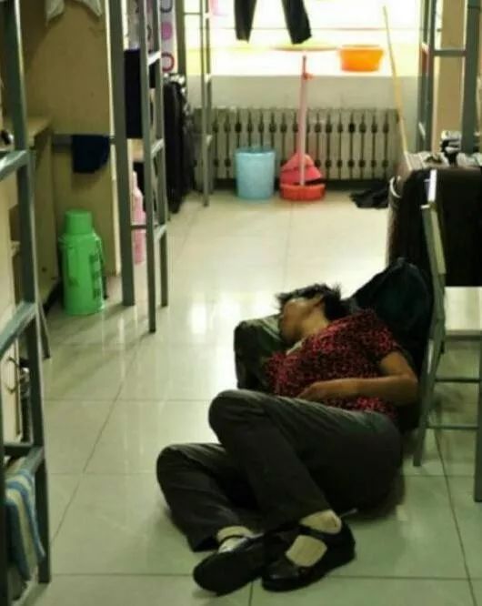 一位母亲送孩子去大学报到,给孩子铺好床铺以后,累得在坚硬的地板上睡着了…