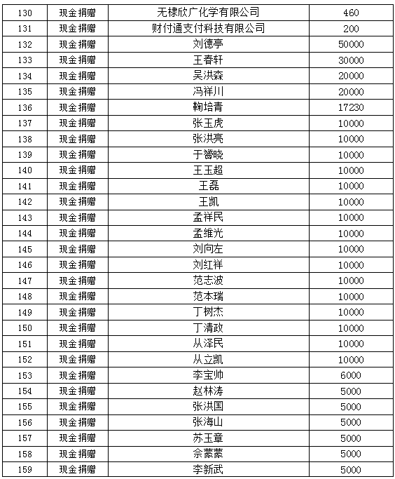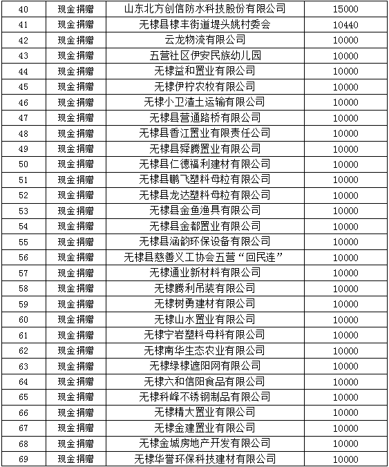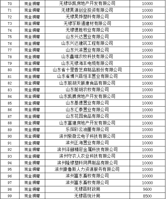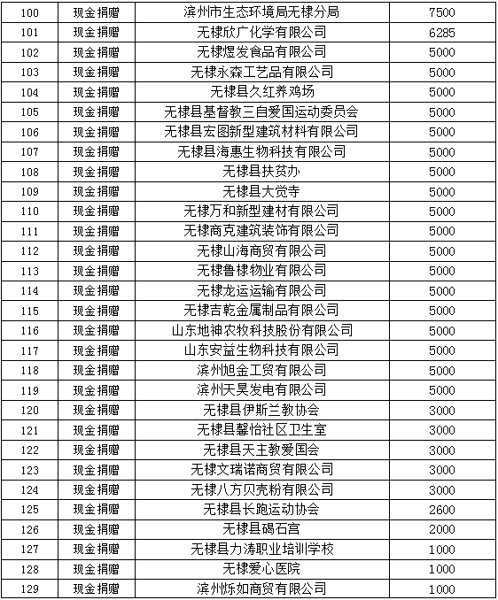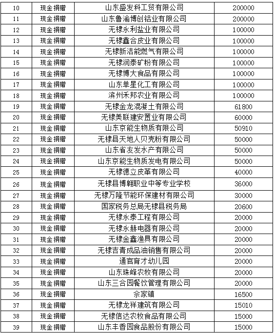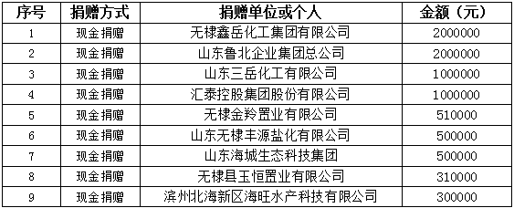 无棣县募捐机构不断收到社会各界爱心企业、爱心人士捐赠资金及物资,现将接收各界捐赠资金及物资情况公布如下: