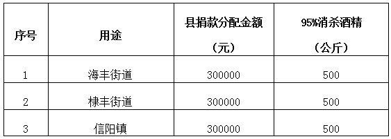 根据无棣县新型冠状病毒感染的肺炎疫情处置工作指挥部《关于拨付第一批募捐资金物资的通知》(第23号)及指挥部要求,现已拨付530万元,现将捐赠资金物资使用分配情况公告如下: