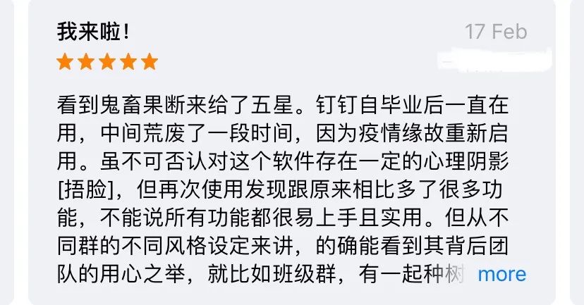 在此之后,更多理智的学生们以及对事态发展看不下去的吃瓜群众理性观众们去应用商店为钉钉打出了更多的五星好评,才使得钉钉的评分稍稍回升。目前来看,软件的页面下已经是清一色的理性发言和五星评分,不过由于之前怒打一星的人数过多,目前钉钉在苹果应用商店的评分仍然只有略显可怜的2.6星。