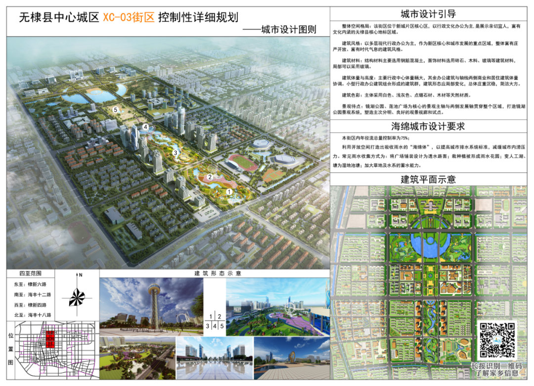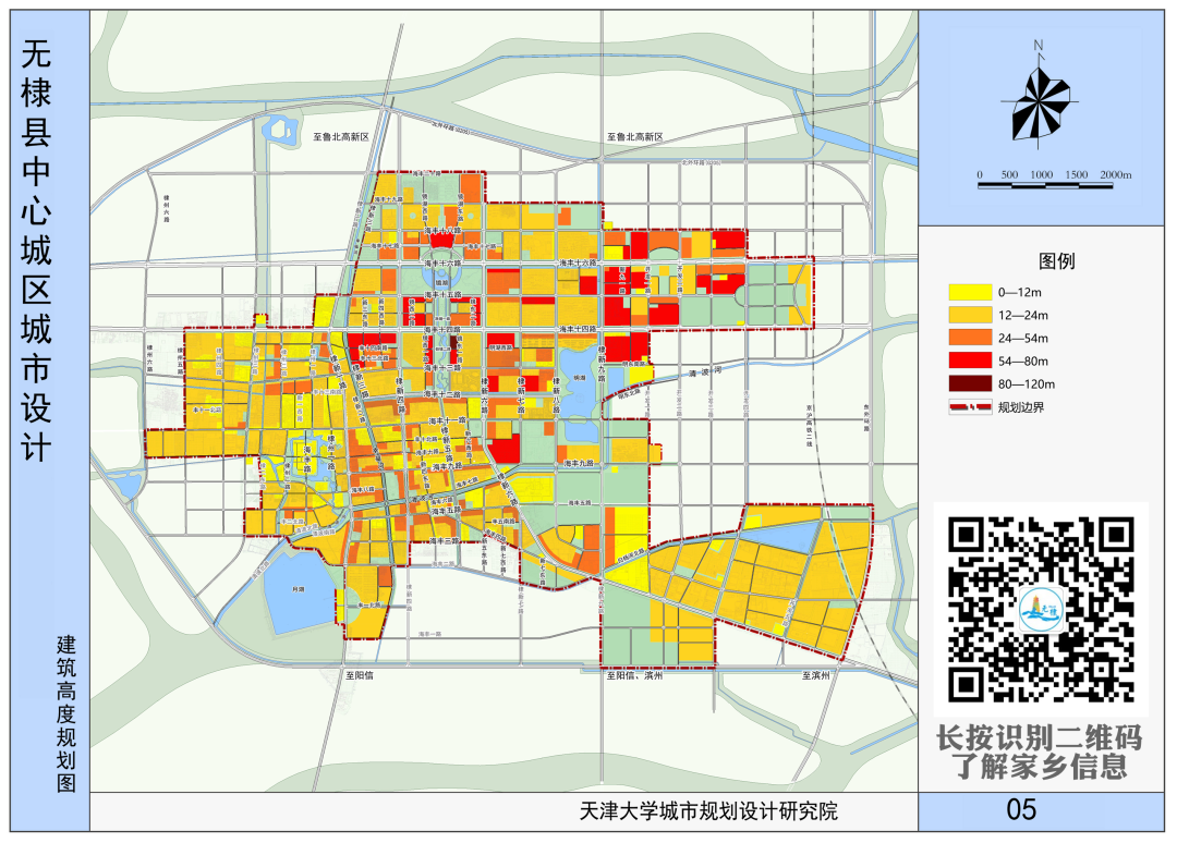 4、城市设计体系(1)重点景观风貌区主要指新城综合服务中心、古城文化旅游服务中心、海瓷产业服务中心等无棣城区内的行政商贸办公区、文化核心区等大型公共服务设施聚集区,也是中心城区城市设计和规划控制的重点地区。该区域景观风貌突出中心城区历史文化、时代发展特征的同时适度地体现了鲁北城市的传统建筑特色,该区域为中心城区景观最丰富、最具时代气息和文化魅力的地区。(2)重要道路景观风貌区海丰十六路,是对外展现城区总体形象的门户型通道,承担着体现中心城区时代风貌的职能。道路两侧建筑风貌从西向东依次体现现代办公建筑风貌、现代居住建筑风貌、海瓷风情时尚风貌;城市设计重点突出中心城区的风貌特色和城市发展建设理念,推动与新城区和高铁新区之间的联系和互动式发展,成为中心城区土地价值最高、商业人气最旺的区域。沿街的建筑体尺度较大,并对建筑高度、建筑色彩提出严格的控制要求。海丰九路,为古城、老城区内东西向文化商业集中分布轴,是体现古城、老城历史文化景观的“历史-现代空间生长轴”。城市设计重点突出中心城区丰厚的历史文化底蕴,建立起传统街区与老城区之间沟通的纽带,沿街的建筑体尺度较小,并对建筑高度、建筑色彩提出严格的控制要求。自西向东建筑风貌体现为古城传统风貌、带有传统元素符号现代风貌、时尚现代风貌。镜湖公园至棣新五路,为中心城区南北向的主要景观轴线,是中心城区的“主体空间发展轴”。轴线中心为内外联动复合开放空间带,周边用地为较大体量较高密度主体功能区。镜湖公园周边建筑体现为高层高密,富有韵律,裙房连续,是体现无棣现代生态景观风貌的标志性区域。棣新五路两侧城市设计以体现老城活力风貌为主,但在建筑风格、建筑高度、建筑色彩上应注重与周边建筑的协调。(3)水体岸线体系规划在无棣水系繁多、连而不通的现状条件下,增加四处沿路水系,形成五湖十河的水系结构。对部分岸线的改造解决水网近而不亲的问题,设计游憩型岸线、观赏型岸线、生态型岸线,从而激活了三心两核多节点的城市活力。(4)慢行体系规划营建便道系统,串联整个城区。在重要节点营造休闲游线。通过散步、骑行、游憩、休闲在重要节点处形成24h休闲活力区。(5)建筑高度控制建筑高度按功能分区、建筑性质分别进行控制,共分为5个级别,即80—120m以上标志性建筑区、54—80m高层区、24—54m小高层区、12—24m多层区、0—12m低层区等。各片区核心区域,即商业、文化建筑集中地段以及重要节点为80m以上标志性建筑区和高层建筑区,此外逐次向外为则分别为小高层区、多层区、低层区。