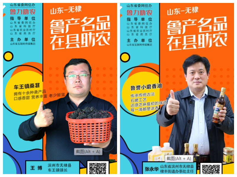 鲁力助农,吃它没“桑”量,车王镇镇长王博直播为车王旅游商品桑葚代言;棣丰街道办事处主任张永华直播为棣丰旅游商品十里香小磨香油代言。