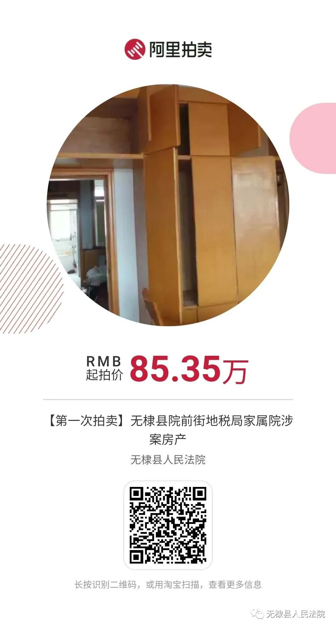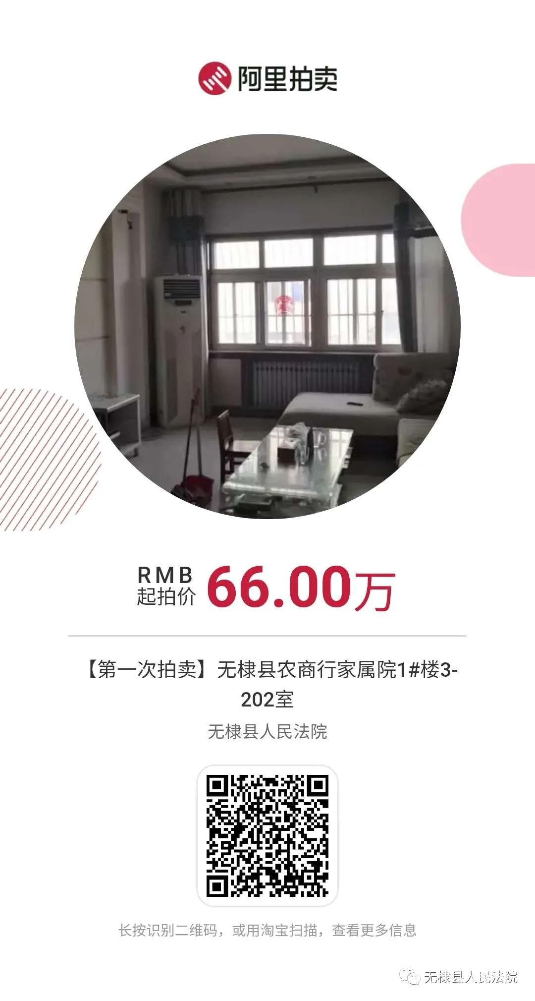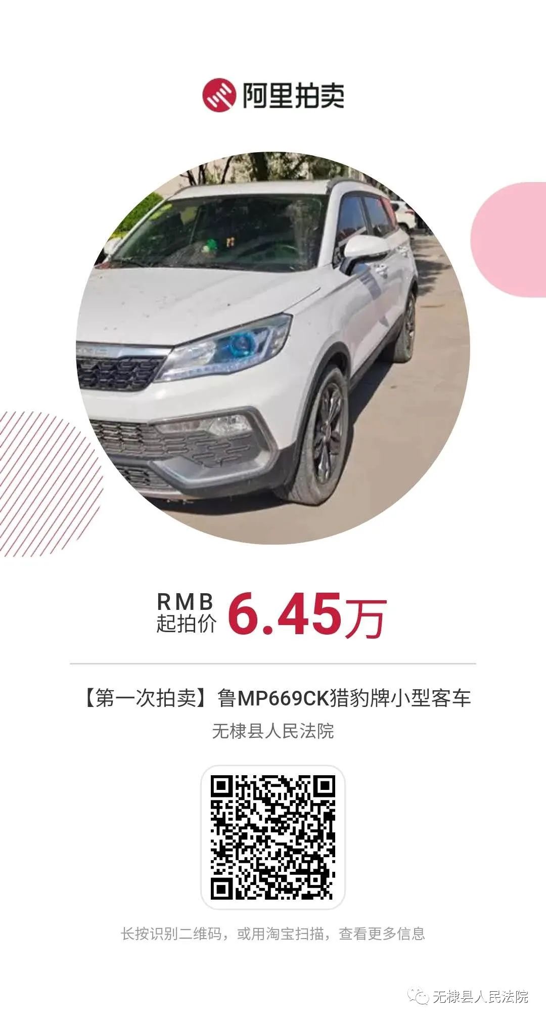无棣县人民法院将于近期在山东省无棣县人民法院淘宝网司法拍卖网络平台上(网址:http://sf.taobao.com/0543/02,户名:无棣县人民法院)进行公开拍卖活动,扫描二维码可获知拍品详细信息及拍卖公告、竞买须知等,有意者请按要求参加竞买。