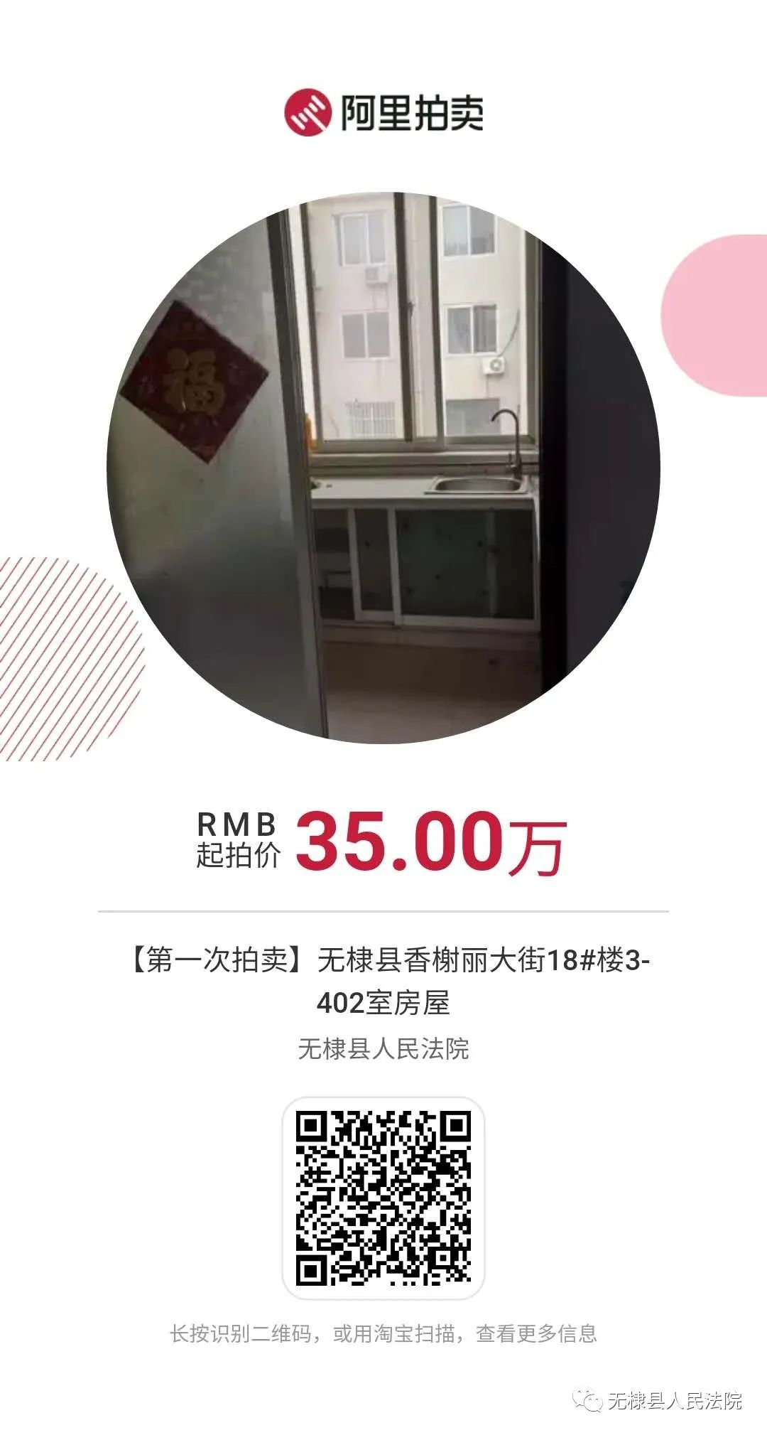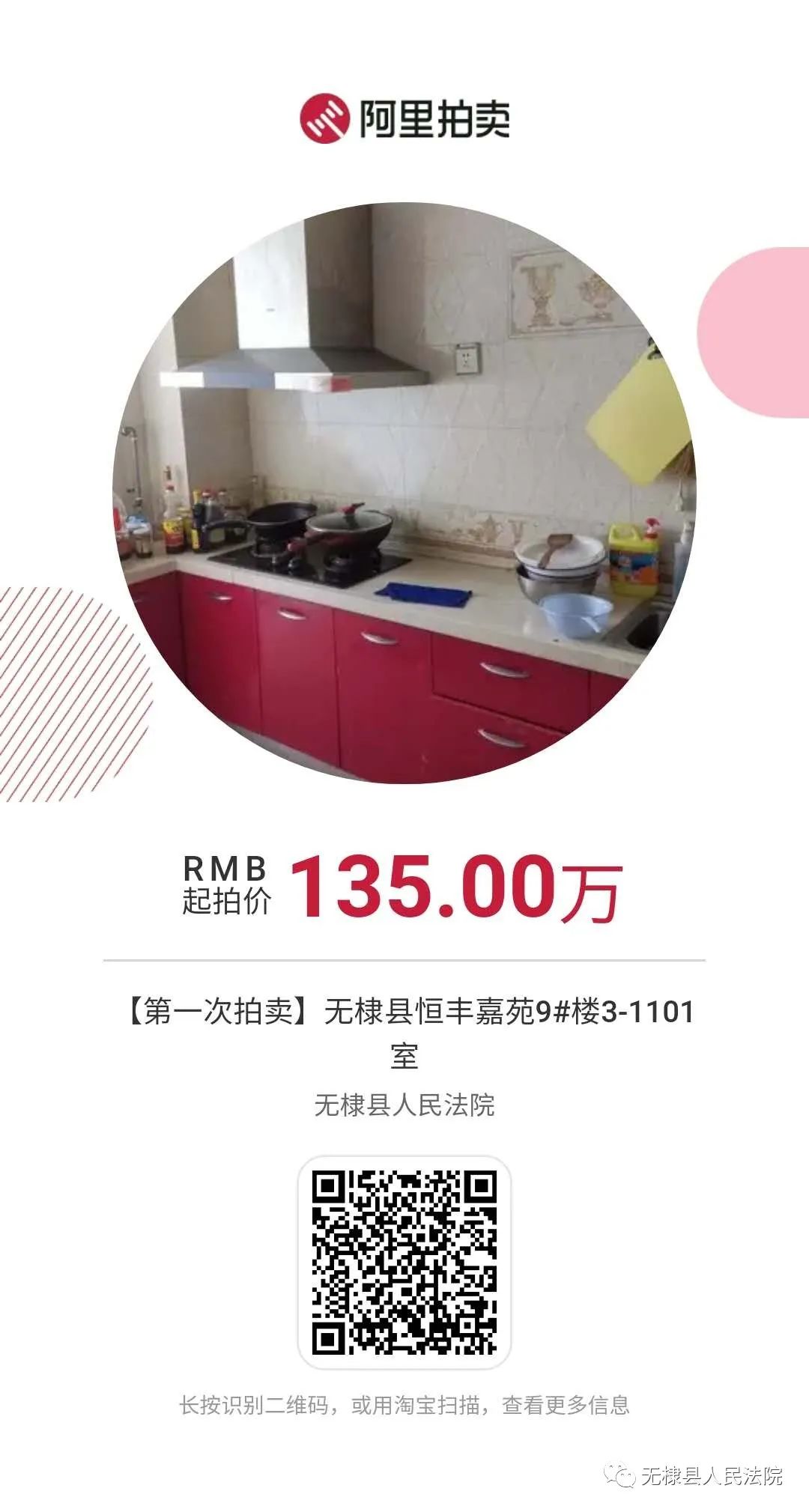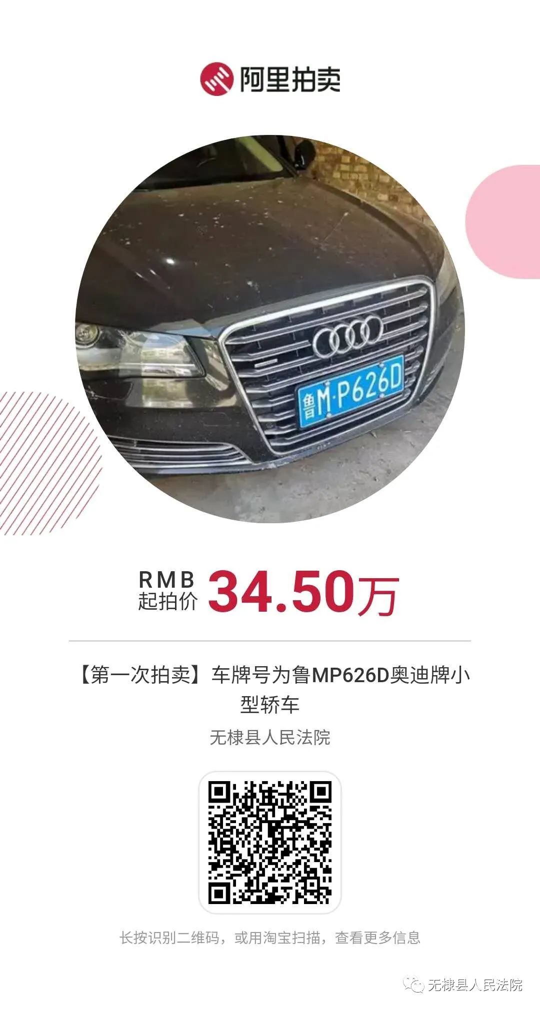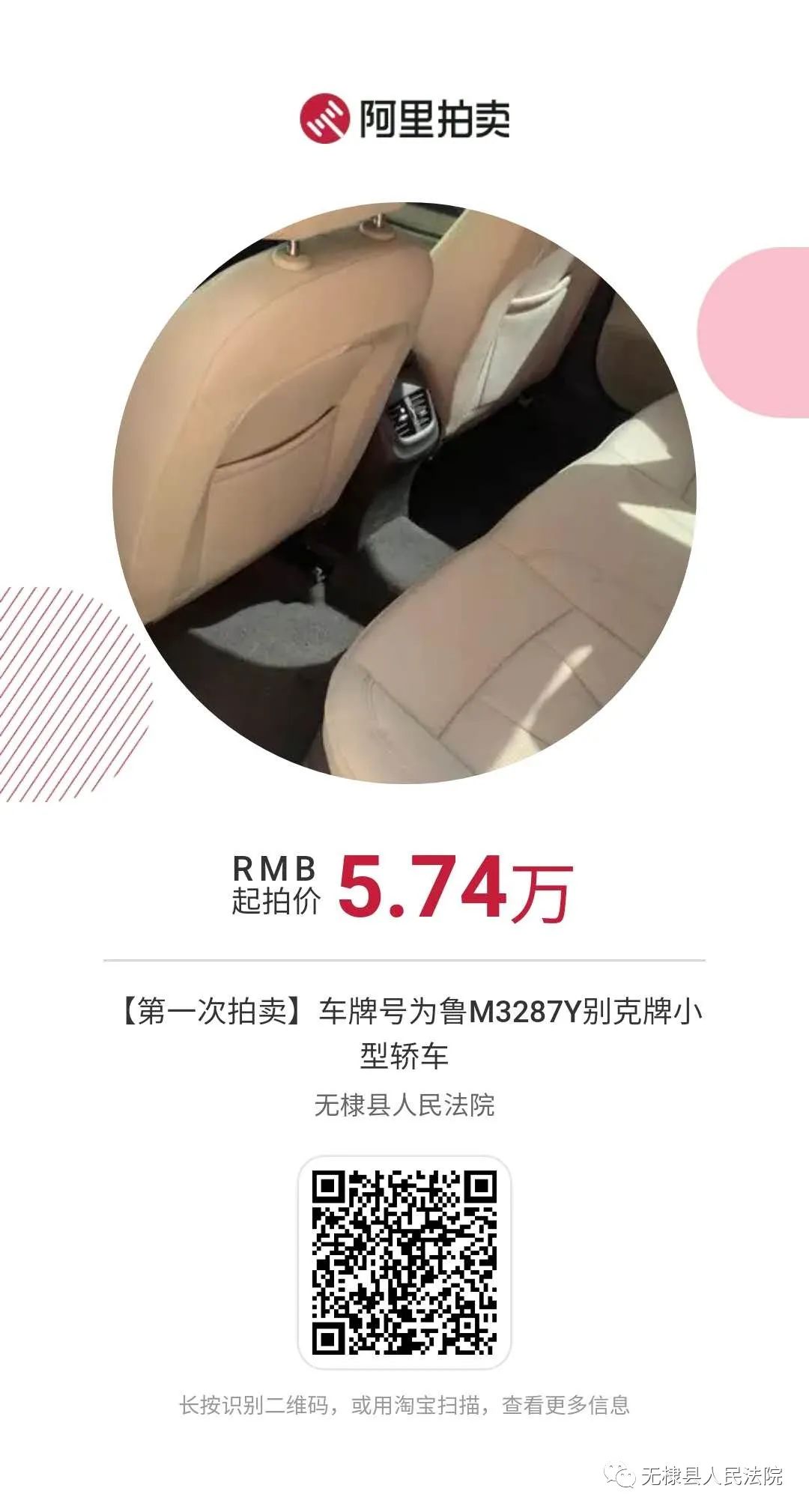 无棣县人民法院将于近期在山东省无棣县人民法院淘宝网司法拍卖网络平台上(网址:http://sf.taobao.com/0543/02,户名:无棣县人民法院)进行公开拍卖活动,扫描二维码可获知拍品详细信息及拍卖公告、竞买须知等,有意者请按要求参加竞买。