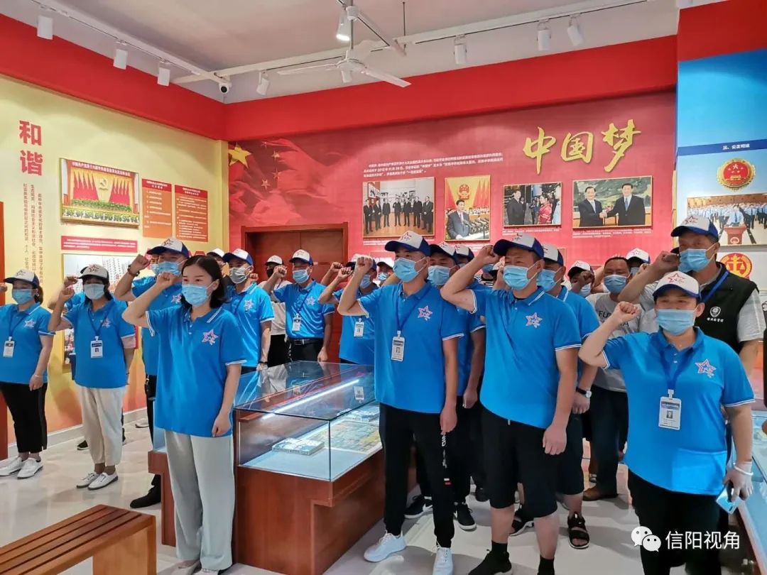 在综治办主任杨晨的领衔下,信阳镇全体网格员身穿蓝色网格体恤,佩戴好蓝色网格帽子和工作证,面向党旗庄严宣誓,“只要群众需要,我们无怨无悔……我们以网格员的名义宣誓:要让生命之花扎根在人民最需要的地方,盛开在人民的心坎里。誓言如钢似铁,掷地有声。
