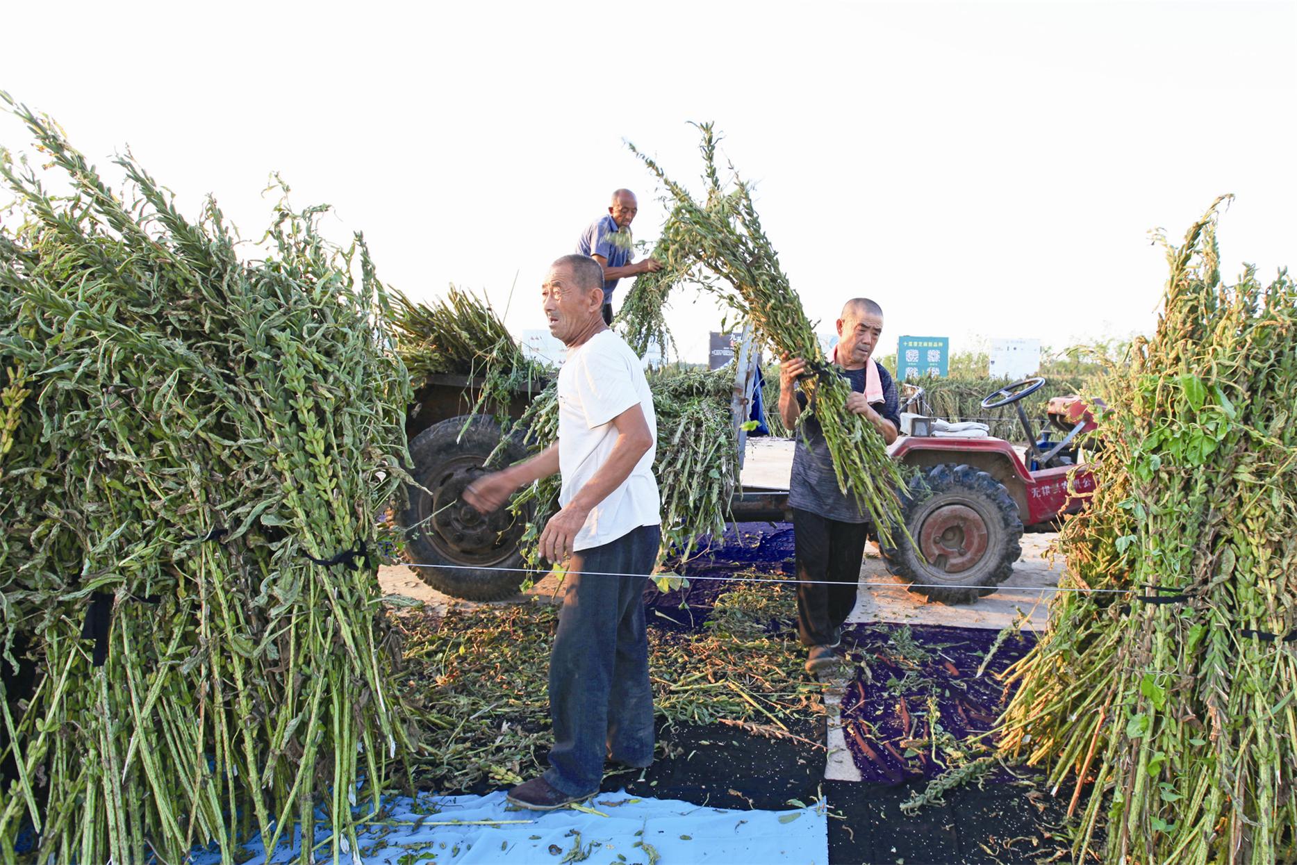 近日,在十里香公司万亩芝麻基地,工人们正在收获芝麻。据悉,十里香公司万亩芝麻基地已通过中国良好农业规范GAP认证,是目前中国最大的GAP芝麻种植基地。十里香公司立足优势,大力发展航芝1号、中芝20等优质芝麻品种,该品种由中国农业科学院油料作物研究所利用航天育种技术培育而成,千粒重2.8~3.2克,品质优,适宜性广。目前,十里香公司万亩芝麻基地自种面积2000亩,订单农业8000亩,预计可收获芝麻1500吨,70%已被美国、英国、俄罗斯、悉尼等国外客户订购。通过GAP基地种植的高品质芝麻亩产效益达到6000元以上,带动了无棣及周边地区农户1200 户增收致富,户均增收8600 元以上,力争通过3年的发展,在无棣及周边地区推广芝麻种植达到10万亩以上。(孟维国)