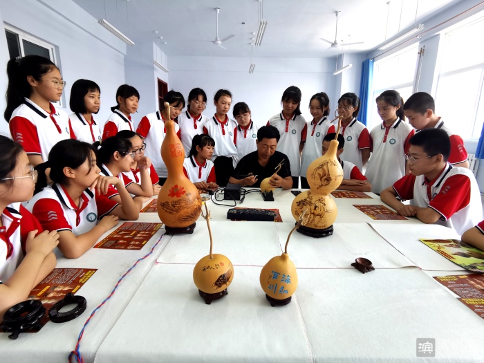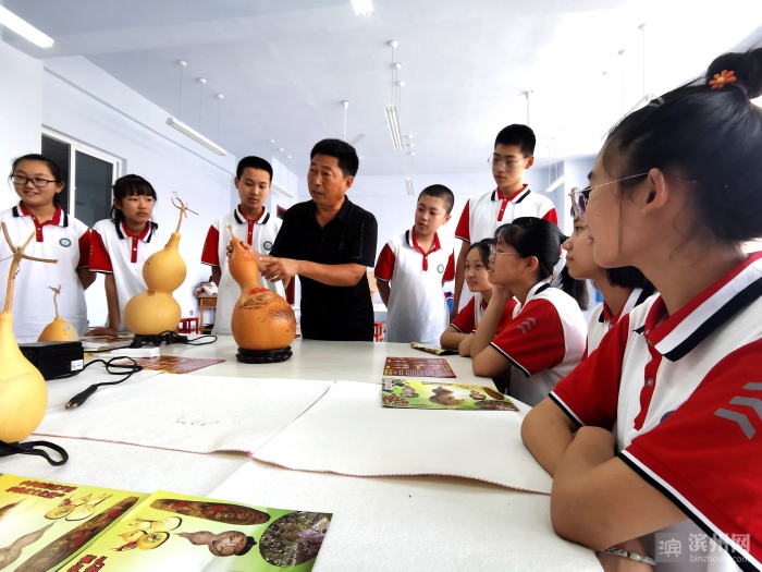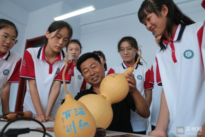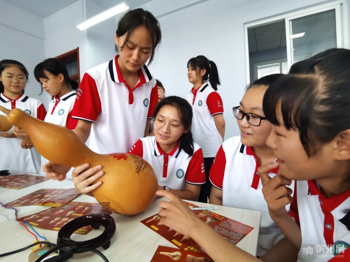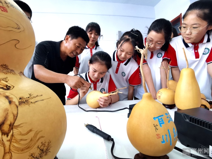 滨州日报/滨州网讯 7月6日,在无棣县水湾镇中学,该校美术社团的同学们正在聆听葫芦刻画(烙画)非遗传承人方以忠讲解葫芦烙画技巧。
