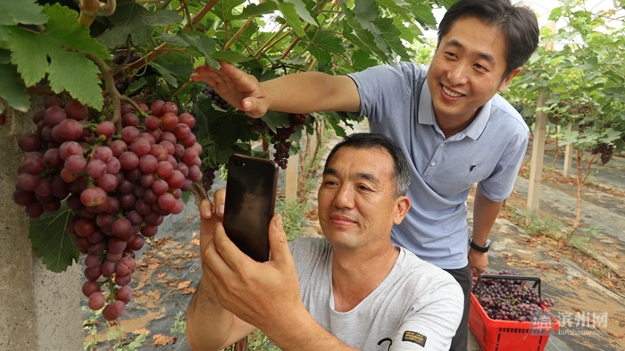 海丰街道吴八里村村南,百余亩的绿洲有机葡萄园里藤蔓缠绕,一串串晶莹剔透的葡萄束挂满枝头,空气中弥漫着甜甜的香气。藤蔓间,果农刘建民正托着“娇艳欲滴”的葡萄采集照片,准备整合提交上“智连乡村”平台售卖。