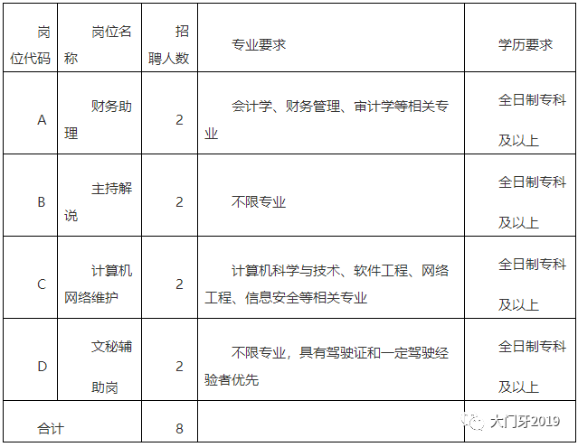 根据工作需要,受无棣县文化和旅游局委托,按照“公开、平等、竞争、择优”的原则,滨州金盛源人力资源有限公司面向社会公开招聘服务工作岗位工作人员8名,现将有关事项公告如下:一、招聘计划具体岗位计划、专业要求、学历要求等详见下表