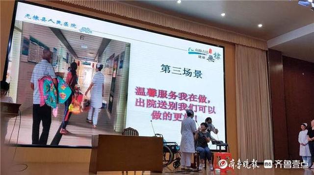 场景三照片:“温馨服务我在做,出院送别我们可以做得更”,随着温馨服务活动的实施,医务人员对每一个出院病人都做到了主动帮助,亲切送出。
