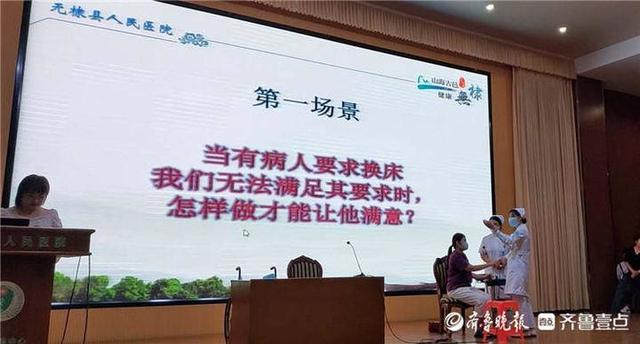 场景一照片:当病人要求换床,医务人员无法满足其要求时,怎样做才能让病人满意?通过展示说明:相同的问题,不同的角度考虑,不同的沟通方式,就会有不同的实际效果。