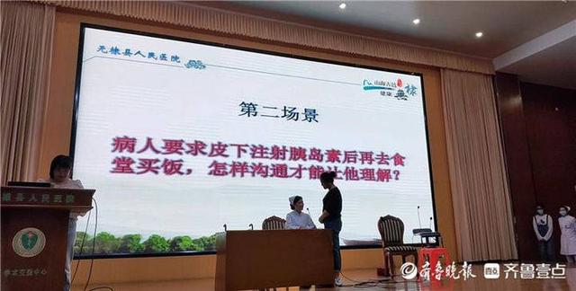 场景二照片:病人在未准备好饭菜的情况下要求注射胰岛素,护士不予注射,怎样沟通才能让其理解呢?展示说明:护士要想得到患者的理解,必须诚心诚意地对待患者,把握好语气、语调、语速,做好解释,使病人感到亲切,提高病人治疗护理的依从性,使其有话愿意同医务人员说,这样才能知道知道病人想什么,担心什么,从而更有利于沟通交流。