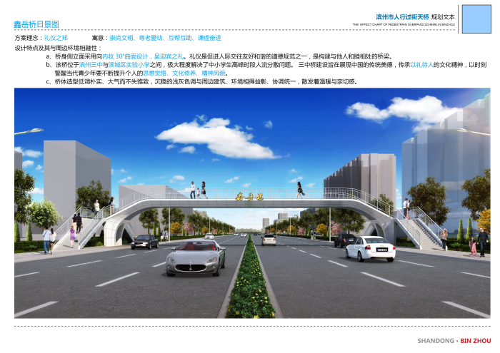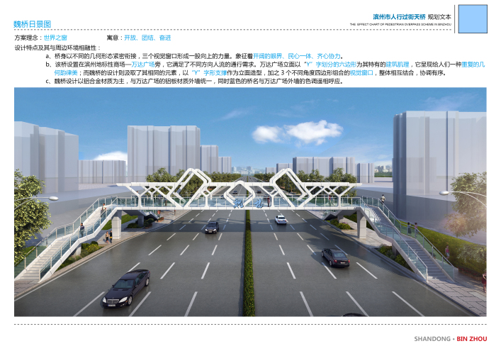 其中,渤海十一路“魏桥”为东西走向,桥梁全长36.2米,桥面宽度为4米,人行梯道宽2.5米。“魏桥”位于万达广场附近,在设计上以“Y”字支撑作为立面造型,与万达广场“Y”字划分的六边形立面相一致,呈现出几何韵律美。“魏桥”以“世界之窗”为设计理念,桥身设计了3个不同角度的四边形作为视觉窗口,形成一股向上的力量,象征着开阔的眼界、民心一体、齐心协力。
