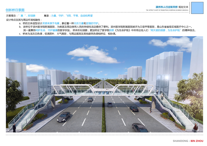黄河二路“创新桥”呈南北走向,桥梁全长30米,桥面宽度为4米;桥梁两端设置垂直升降电梯,人行梯道宽2.5米。“创新桥”位于滨医附院附近,在设计上突出了“翼”的理念,象征着无形的力量和坚强的守护,与滨医附院呵护生命、守护健康的医学宗旨相呼应。“创新桥”的外观为浅灰白色调,大气雅致,与周边医院及其他建筑色调相协调。