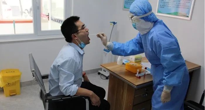 给患者查体:T 38.5℃,P 96次/分,R 24次/分,心肺(一)。发热门诊值班医生书写病历、开具医嘱,护士做好个人防护后采血、取鼻咽拭子、肛拭子,按要求保存,送往县级相关部门进行检测。