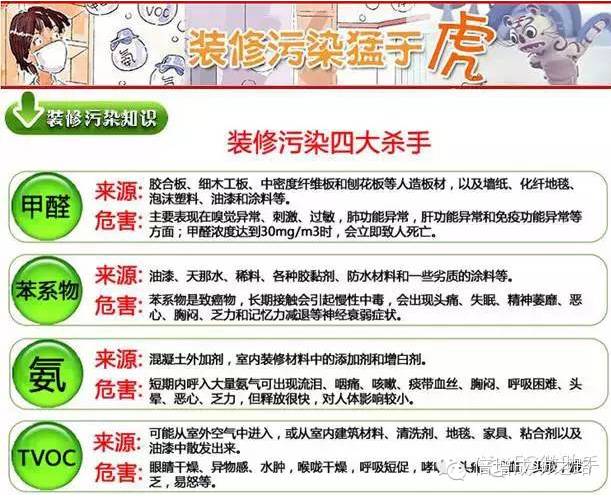 众所周知,常见的家装污染的四大杀手是:甲醛、苯、氨、氡。