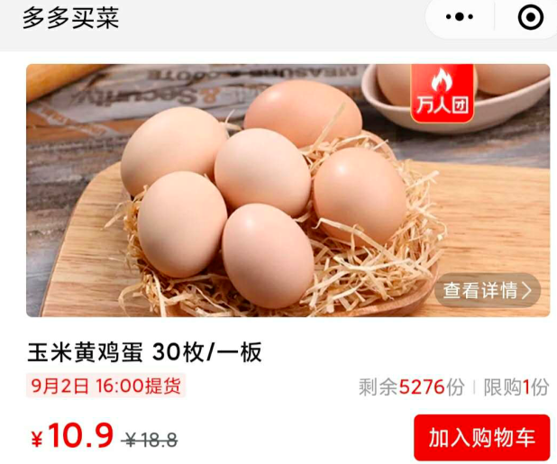 “多多买菜”上线后,平台上的商品均价远远低于市场零售价,而且是肉眼可见的那种低。比如说,30个鸡蛋仅10.9元,1斤土豆仅售8毛钱。