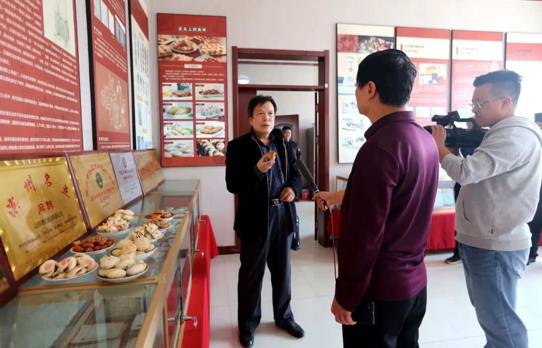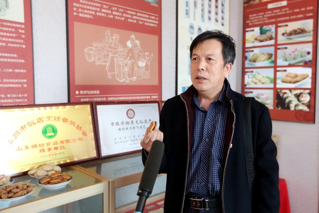 新当选的离退休支部书记丁宝潭同志现场为省非遗、省老字号“塘坊糕点”代言,接受县融媒体中心记者采访。