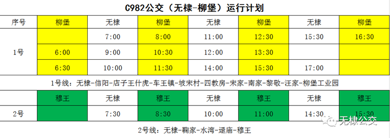 C982无棣至柳堡线路,因穆王至宋家庄路段维护,公交车无法通行。2020年10月29日起执行临时计划,以下是线路途径站点及发车时间: