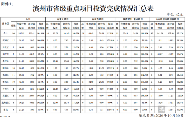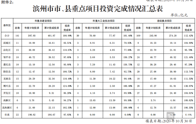 惠民县。重点投资项目34个,其中,省市县重点固定资产投资类项目31个,年度实际完成投资72.33亿元,占年度计划107.2%;市级重大技改类项目3个,年度实际完成投资11.43亿元,占年度计划158.8%。重点投资项目全部开工。