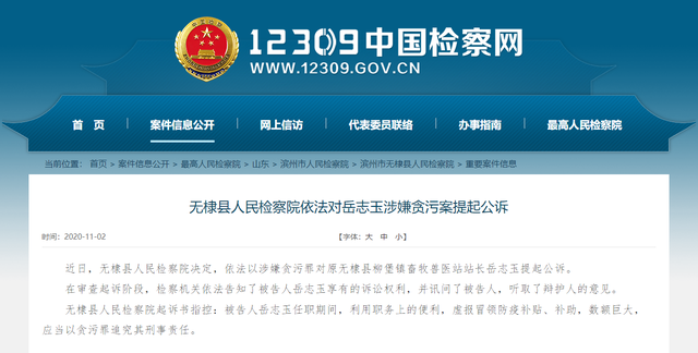 近日,无棣县人民检察院决定,依法以涉嫌贪污罪对原无棣县柳堡镇畜牧兽医站站长岳志玉提起公诉。