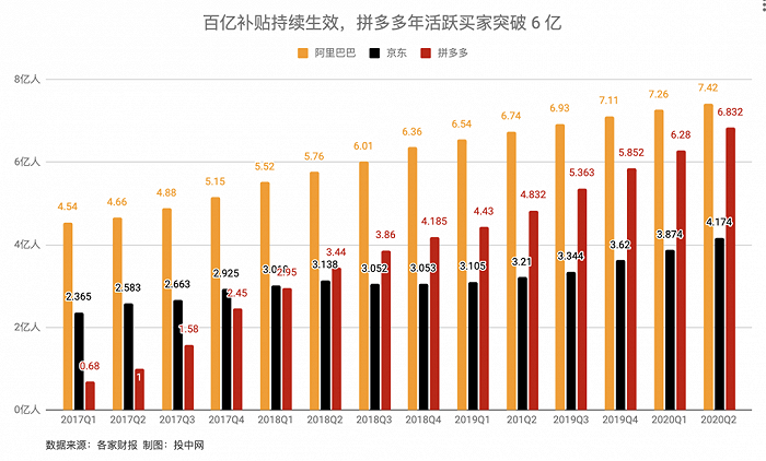 在提高变现和获取流量增长,拼多多一直都是选择后者,通过不断烧钱补贴来吸引用户和商家。