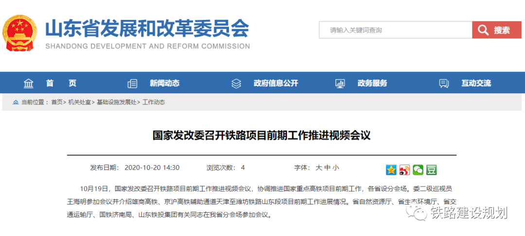 山东省发改委消息:10月19日,国家发改委召开铁路项目前期工作推进视频会议,协调推进国家重点高铁项目前期工作,各省设分会场。