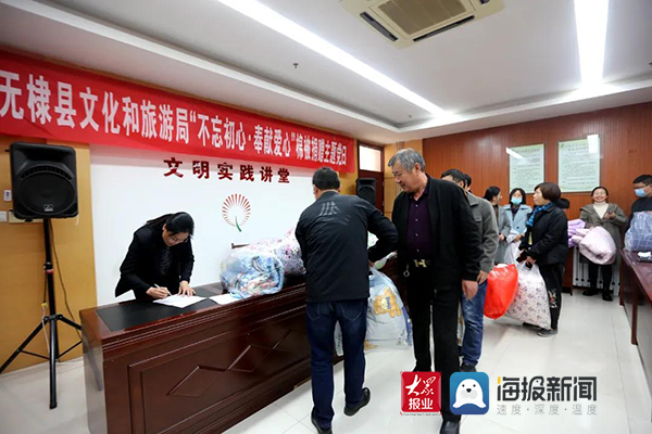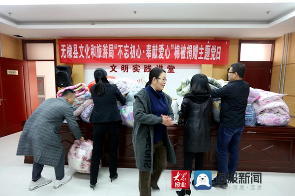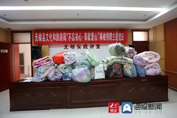 11月6日下午,无棣县文化和旅游局组织开展“不忘初心奉献爱心”棉被捐赠主题党日活动,号召大家奉献点滴爱心、助力脱贫攻坚,将家中闲置的冬日棉被进行捐赠,现场捐赠棉被40余套,为急需帮助的贫困家庭送去冬日温暖。党组书记、局长郭文江在外出发收到局里要开展这个棉被捐赠的主题党日活动请示汇报后,特意嘱托家属把棉被送到了捐赠会场。