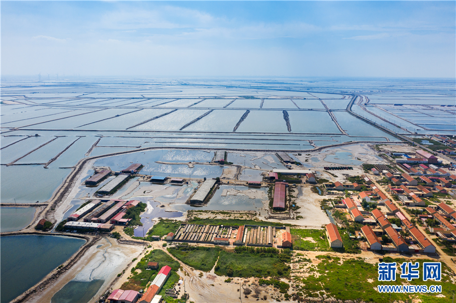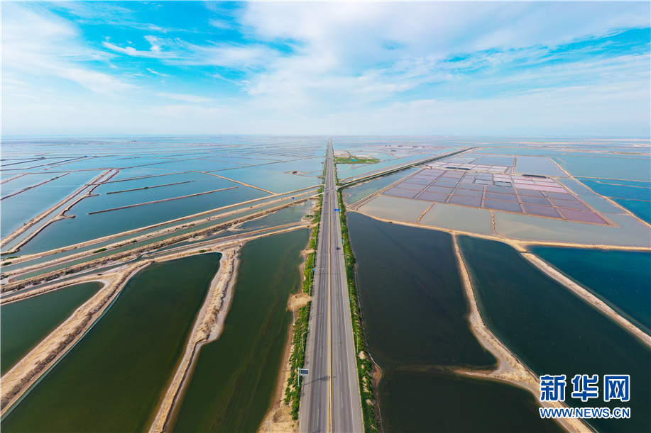 在山东省滨州市无棣县鲁北盐场,“七彩盐田”独特景观如诗如画,在阳光、海风和温度的共同作用下,水不断蒸发,因为咸度和蒸发结晶速度的不同,整齐排列的盐田呈现出色彩斑斓、绚丽多彩的独特风景,宛如一块平铺在大地上的调色盘。