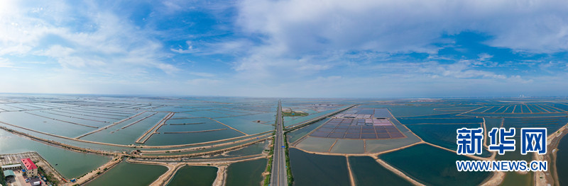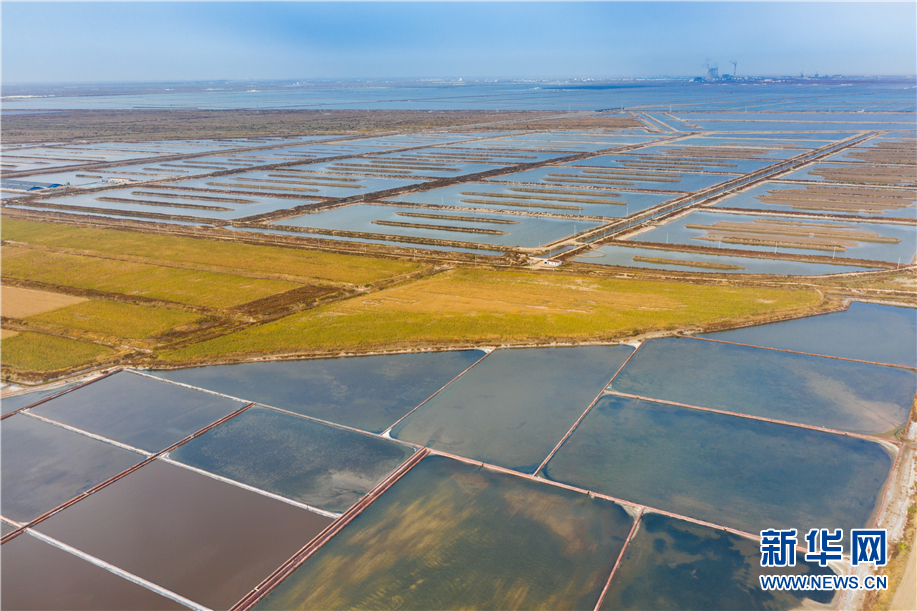 风轻云淡,碧空如洗。一片片盐田星罗棋布,从高空俯瞰,好似平铺在大地上的眼影盘。新华网发(刘永明 摄)