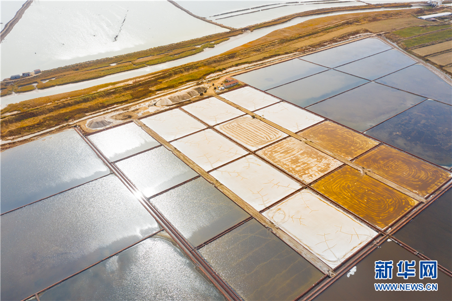 由于盐池中海水的浓度不同,各个盐池的颜色也各不相同,从空中俯瞰,色彩斑斓、美不胜收。新华网发(刘永明 摄)