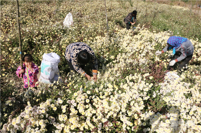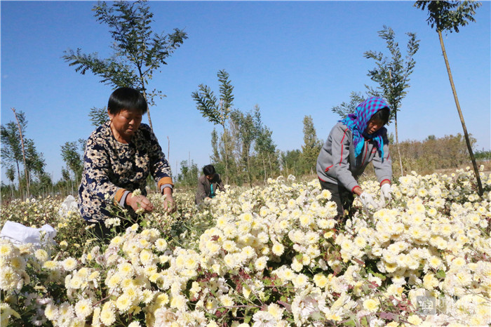 10月30日,无棣县海丰街道冯家村千亩田种植专业合作社的社员正在采收杭白菊。
