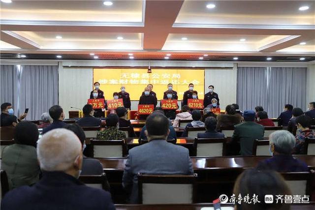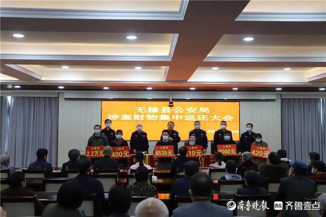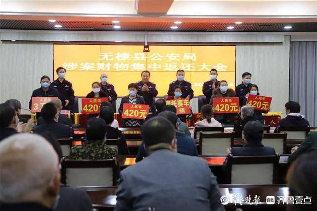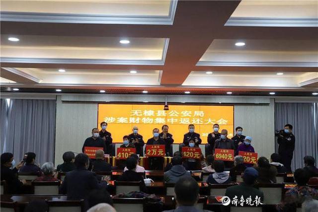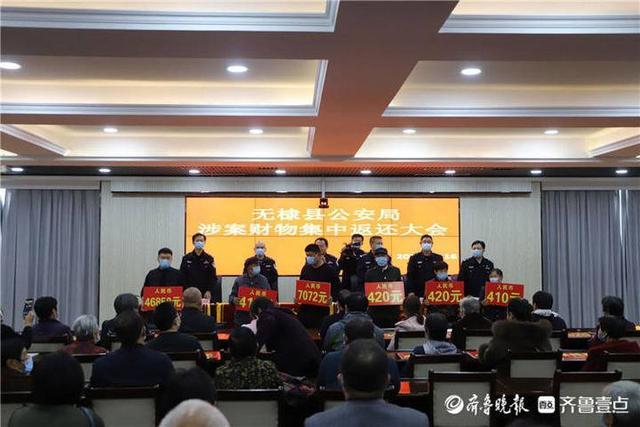 11月16日,无棣县公安局召开涉案财物集中返还大会。现场发还53名受害群众现金80余万元,摩托车1辆、贵重手表3块、手机4部。
