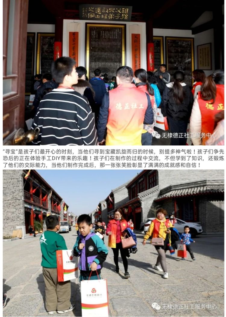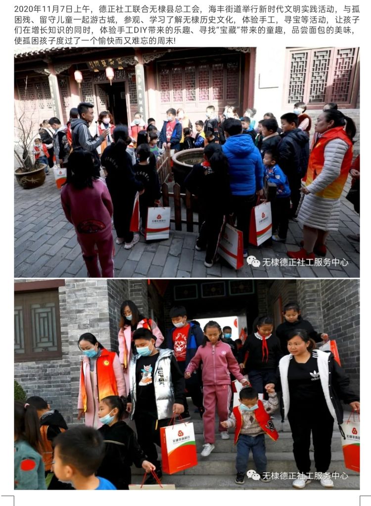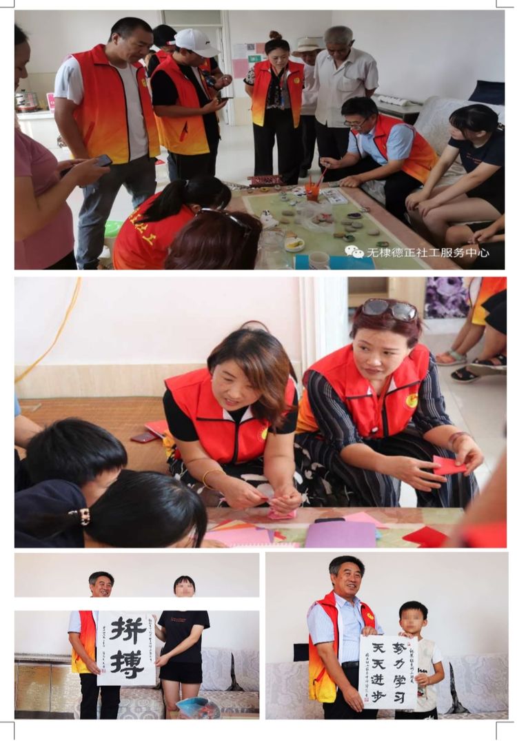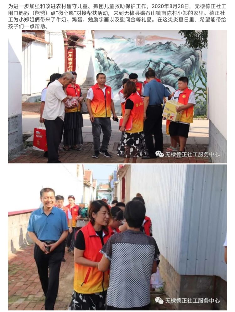 2019年暑假,德正“候鸟课堂”开启,假期期间为留守儿童提供陪伴、心理辅导及德育教育,累计服务人次352人次,累计服务时间180小时。同年7月,参加县民政局开展的“围巾妈妈(爸爸)”志愿帮扶活动,一对一帮扶14人,定期不定时为帮扶对象提供物质和精神帮助。随着活动的不断推进,带动和影响了更多的爱心人士参与进来,截止2020年1月,累计服务时间215小时,参与人员达322人次。2019年10月31日,诚邀滨州市红十字会,以发扬“人道、博爱、奉献”的红十字精神,开展救人自救技能培训,培训共2天,参与人员51人,全员参与全程并全部通过考核。2020年元旦,精心策划,以别样的“大换装”陪伴环卫工过新年,组织慰问城市的美容师活动。同年1月18日,分别发起“爱心永恒,初心不变”和“送温暖献爱心”系列活动,慰问孤苦儿和孤寡老人;2020年春节期间,积极响应政府号召,多次组织会员走进社区值守、宣传疫情防控、免费发放防疫口罩,积极倡议并组织多渠道多次为抗疫一线捐款捐物,累计价值68000余元;2020年2月,信阳镇双堠村大量香菇因疫情无法外送滞压,危急关头,德正社工党支部挺身而出,积极发动近三百德正会员带头订购,并通过朋友圈、微信群、工作群等各大商超及平台,为双堠村民销售香菇三万余斤,为村民排除了难关,挽救了经济损失;20年6月14日,为迎接第17个“世界献血日”,发动组织45名队员进行无偿献血;2020年端午节,组织慰问小泊头镇梁郑王村退伍军人和老党员;20年8月4日,参加无棣县围巾妈妈点亮“微心愿”对接帮扶活动启动仪式,结对10户帮扶家庭,之后按时进行逐户走访和慰问;20年9月5日,开展“中华慈善日”织志愿者宣传,并举行爱心捐赠和爱心义卖活动,并将义卖所得爱心物资及时送到帮扶对象手中;2020年9月,在团县委的指导和帮助下,参与、宣传和启动“希望小屋”活动,旨在为贫困家庭中无独立居住和学习环境的困境儿童修建希望小屋,并于腾讯公益上线“希望小屋启航计划”。截止2020年10月18日,累计公众捐款3917份,筹集公众捐款130658元;2020年9月14日,县妇联联合德正社工及爱心商家举行“助力扶贫,与爱同行”爱心奶粉捐赠活动,为我县家中有0-5岁婴幼儿的30户建档立卡贫困家庭捐赠奶粉,总价值60000元;2020年9月16日,德正社工牵手生命、无私奉献,积极开展志愿捐献造血干细胞采样活动;2020年国庆期间,组织志愿者协助我县举办的“掀起你的盖头来”开成城门系列活动,维持秩序、保护环境、引导游客等;2020年10月24日,德正社工走进小泊头敬老院,开展“情暖夕阳节,爱撒夕阳红”爱老敬老活动,与老人联欢、包饺子、吃蛋糕,为老人理发,并送上新衣服;2020年11月7日,德正社工联合无棣县总工会,海丰街道举行新时代“文明实践 情满枣乡”活动,带受助儿童一起游古城,参观学习无棣历史文化、体验手工及“寻宝”等活动,让孩子们在增长知识的同时,体验手工DIY和寻找“宝藏”带来的乐趣,陪同孩子们一起度过了一个愉快而又难忘的周末,让他们在实践中感受爱的温暖。2020年,无棣德正义工服务中心这支充满活力和热情的团队,被无棣棣丰敬老院、小泊头敬老院、无棣爱心医院、爱心小学等单位评为无棣县“爱心团队”。