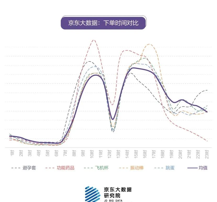 上午9-10点钟是购买避孕套和功能药品最高峰的时间段,下午16-17点是下单购买情趣用品集中的时间段。 从京东后台可以看到,避孕套、飞机杯、跳蛋等用品在晚上8点以后至凌晨2点为购买高峰。 也就是说,卸去了一天的疲惫后,夜深人静是最想入非非的时候。