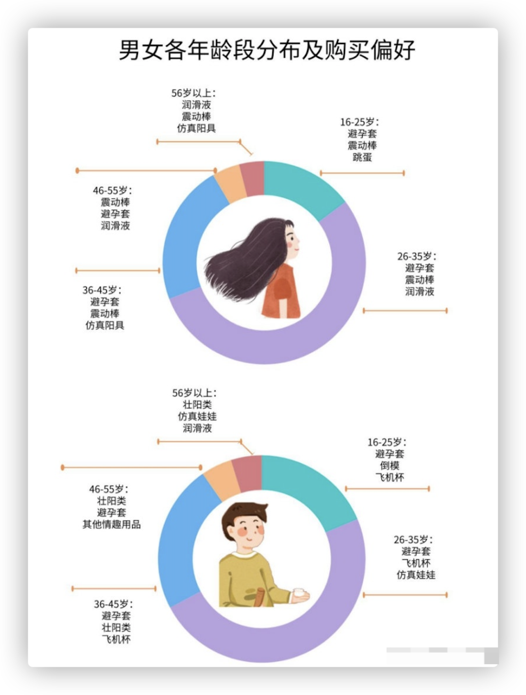 难怪打开京东健康APP,满屏都是男女爱爱、补肾壮阳和和各种牌子的避孕用具。 原来这些让人心跳加速的性用品才是京东健康的真正吸金杀手锏! 2.性用品大数据,你是哪一类? 从某个角度讲,几亿中国人的性需求撑起了京东健康3700亿市值。 那么问题来了: 每天在它上面买买买的都是哪些人? 他们最喜欢的用具到底是什么? 赶紧来看大数据!
