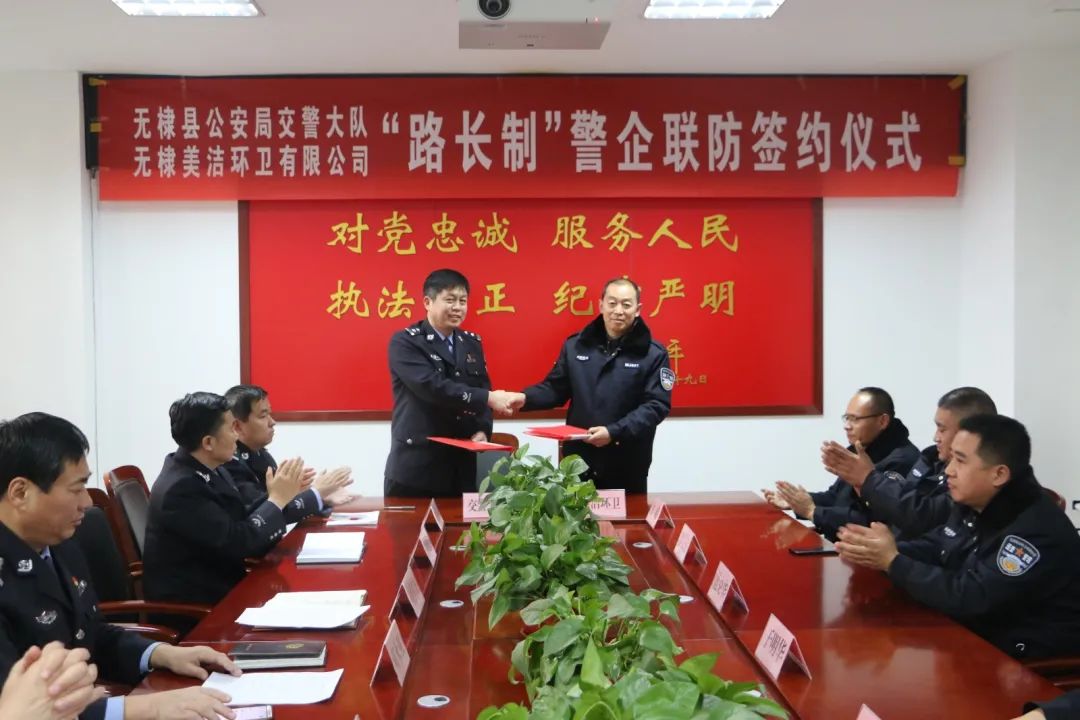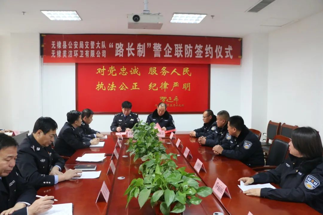 12月9日,无棣县公安局交警大队与无棣美洁环卫有限公司举办“路长制”警企联防签约仪式,签约仪式由县公安局党委委员、副局长邓永强主持,交警大队班子成员及各科室负责人、美洁环卫有限公司于明华经理及相关负责人参加活动。