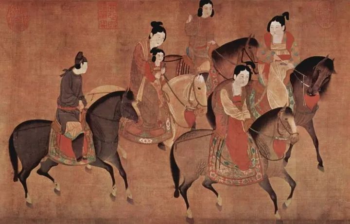 武则天威慑天下的气势,同样赋予了唐代绘画界以创造力。比如张萱的《虢国夫人游春图》。仔细看去,这画中马背上的骑手,已然不是五大三粗的男性英雄,而是柔媚万千的女子。她们身着盛装,不是坐在马车里,而是骑在马背上。以前女子不敢做的事,在唐代,她们统统做了。