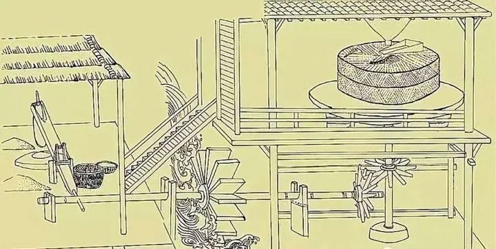 水轮还能用来推磨,加工谷物。把一个大水轮放在湍急的河水中,水流冲击水轮旋转,水轮再带动岸上的磨转动。《农书》记载有“水转九磨”,一个大水轮同时带动了九个磨工作,效率非常高。用现在的话说,这还是百分百的绿色能源。