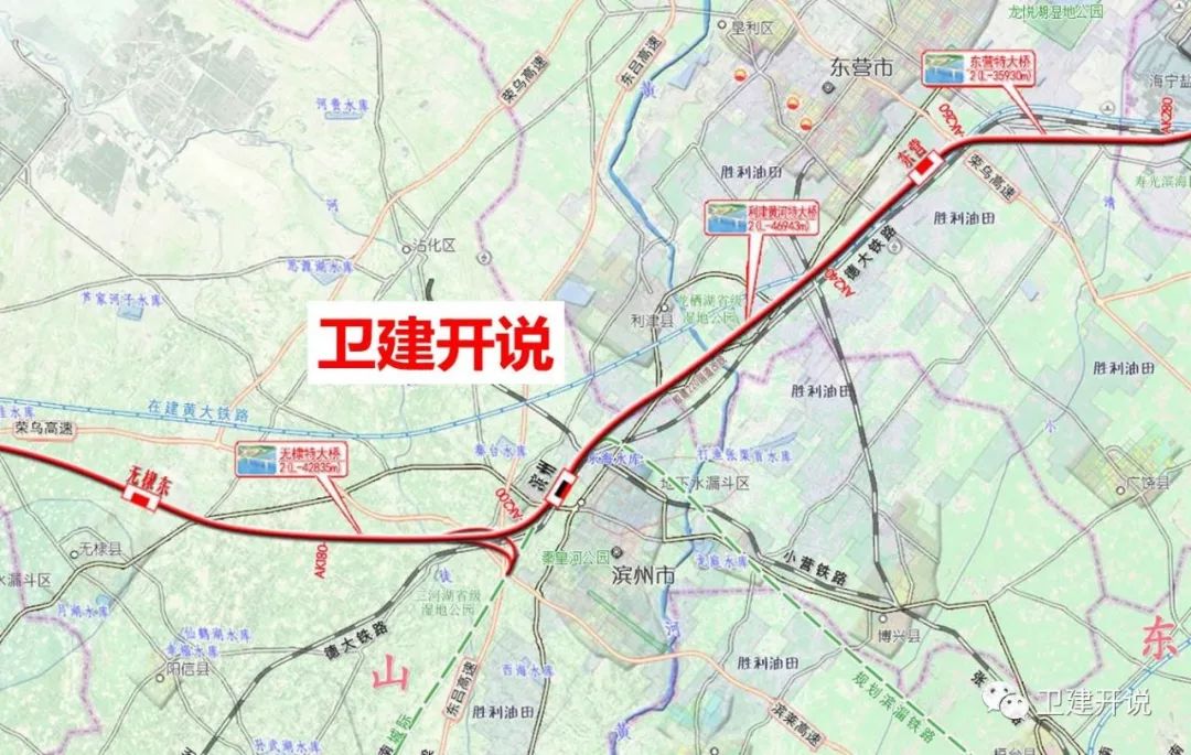 其中指出:滨州至东营至潍坊铁路滨州至东营段位于山东省北部滨州市和东营市境内,线路由德大铁路滨州站普速车场北侧新建高速车场引出,经滨州市、东营市利津县南部跨黄河,向东至德大铁路东营南站北侧新建东营站。