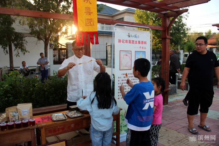 在代家村文化广场,公益电影《乡医老牛》放映前,展示了无棣县非物质文化遗产鲁北三通艺术锣鼓和孙记欢喜团。鲁北三通艺术锣鼓是民间大秧歌伴奏打击乐的基础上逐渐发展形成的,在鲁北、冀东、津南沿海一带,已有三百多年的传承历史。孙记欢喜团作为本地的一种小吃,口感甜、脆、香、酥,生产工艺精细,产品玲珑剔透,由彩丝线串连,因寓“团圆快乐,合家欢喜”之意,故深受群众喜爱。