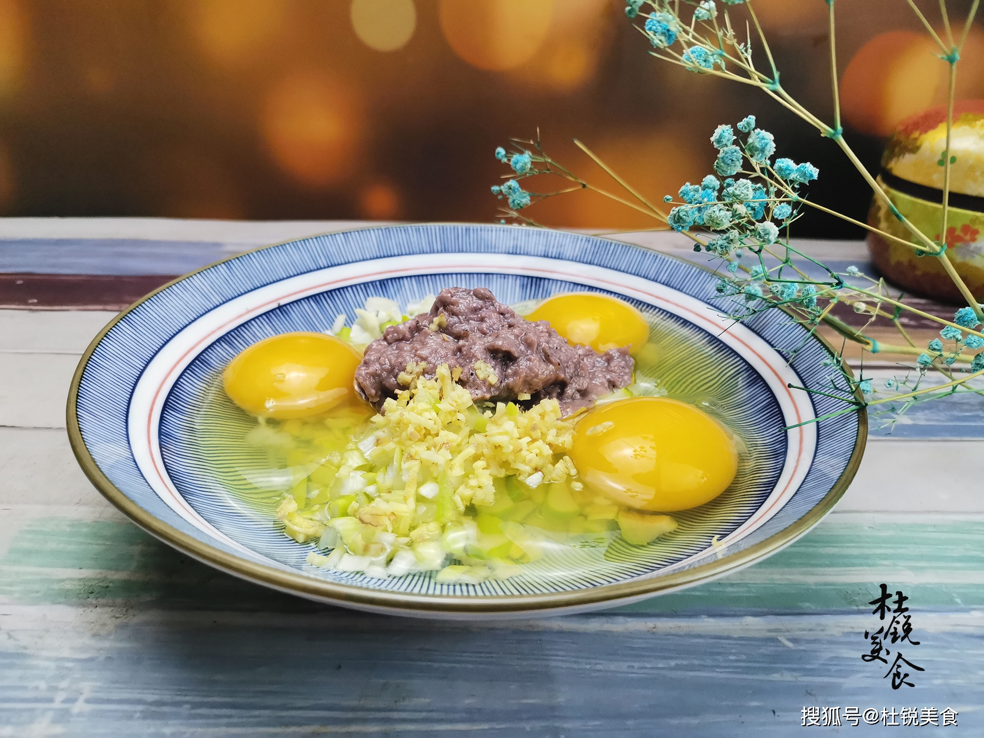 2、大葱100克,切成细葱花;姜5克,切成极细的姜末,一起放入碗内。打入鸡蛋3个,下入虾酱50克,调入料酒10克、胡椒粉0.5克,搅打均匀。