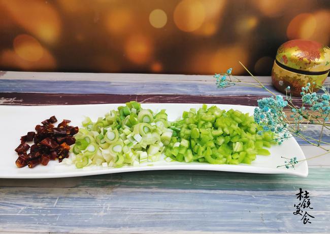 切极细的姜末5克,干红辣椒5-6个,约5克,剪成干红辣椒小段。喜欢吃青辣椒的,也可以切入大半个鲜青辣椒小丁,增加鲜香味道。
